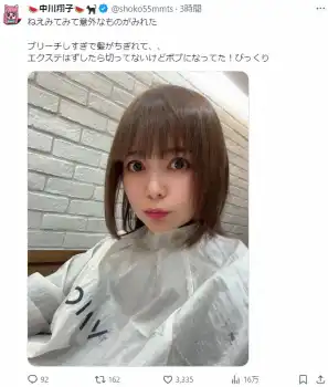中川は「ねえみてみて意外なものがみれた」とつづり、ボブカットになった髪形をアップ。「ブリーチしすぎで髪がちぎれて、、エクステはずしたら切ってないけどボブになってた!びっくり」と明かした。