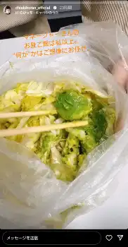 「“何が”かはご想像にお任せ」と、ビニール袋に入った野菜を割り箸でつまむ様子を動画で公開した。