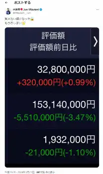 俳優の川久保拓司は「心配になるぜ…!!」のコメントし、水谷氏も「やばいっす」と反応。フォロワーからは「日経平均史上最高値の日にナゼ?」「大変そうですね。無理せず休息をとってください」「これはやばいですね」「凄い額ですね」「額のアップダウン激しすぎて」「合法賭場楽しんでますね」「水原さんみたいにならなければ大丈夫」などの声のほか、「評価額1億5000万円…圧倒的な資金力すごいです」「評価額1億5千万???」といったその資金力への反応も寄せられている。
