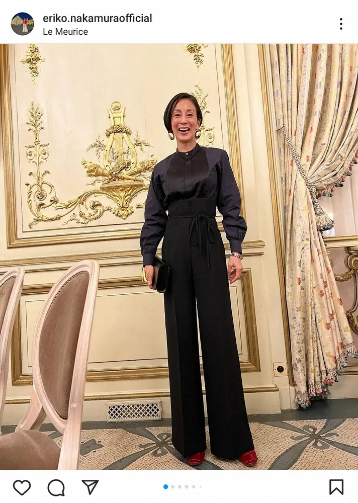 中村は、パリ最古のホテルで開かれたパリ・オペラ座振興会の昼食会に出席したことを報告。「何を着ようか悩んだのですが、困った時にはやっぱりシャツ&パンツスタイルになってしまう私です」と明かした。そして「ネイビーに胸元が黒いシルクになっているシャツに、25年ほど前のハイウエストパンツ」と、写真を公開。「またまた古いものが登場しました」と泣き笑いの絵文字を添えた。