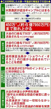 21日に地元紙ロサンゼルス・タイムズや米スポーツ専門チャンネルESPNなど複数のメディアが「巨額の窃盗の疑い」で水原氏が解雇されたと報じ、球団も認めた。ESPNによると、水原氏が「連邦政府の調査を受けている南カリフォルニアのブックメーカーにギャンブルで借金をつくり、大谷の銀行口座から少なくとも450万ドル(約6億8000万円)が送金された」ことから問題が発覚したという。水原氏は解雇前日、選手たちに「私はギャンブル依存症」と告白したと伝えられている。