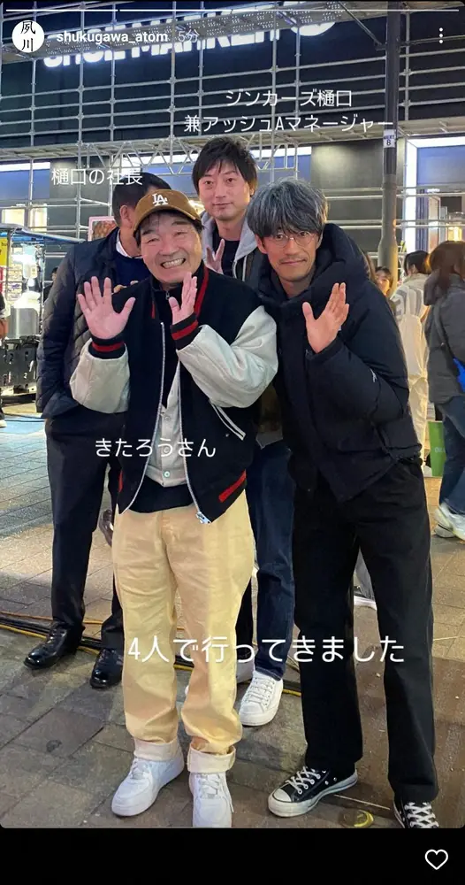 続けて「4人で行って来ました」と投稿。「ジンカーズ樋口兼アッシュAマネージャー」「樋口の社長」「きたろうさん」と、俳優のきたろう、お笑いコンビ「ジンカーズ」とマネジャーを兼任する樋口大輔らとの写真を披露した。