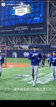 そしてフィールドに降りる様子を動画で掲載。「スター選手達を近くで見れました」と、ドジャースの大谷翔平選手らがウォーミングアップする姿を公開した。
