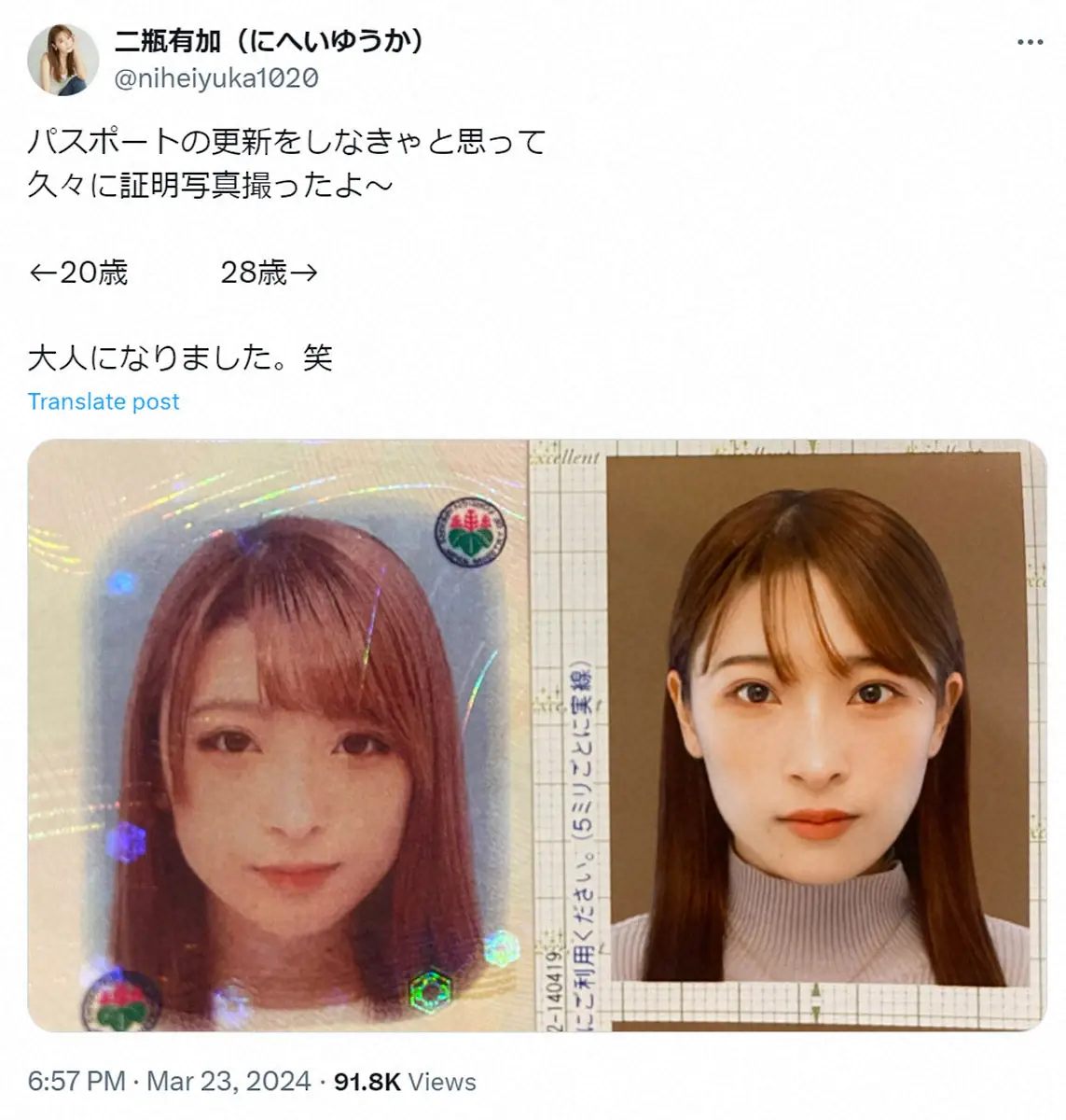 二瓶有加インスタグラム(@niheiyuka.official)から 二瓶有加 20歳と28歳の証明写真公開に反響「素晴らしい年齢の重ね方」「… ギャラリーで見る この記事のフォト 2024年03月24日の画像一覧 もっと見る 2024年03月24日の画像をもっと見る