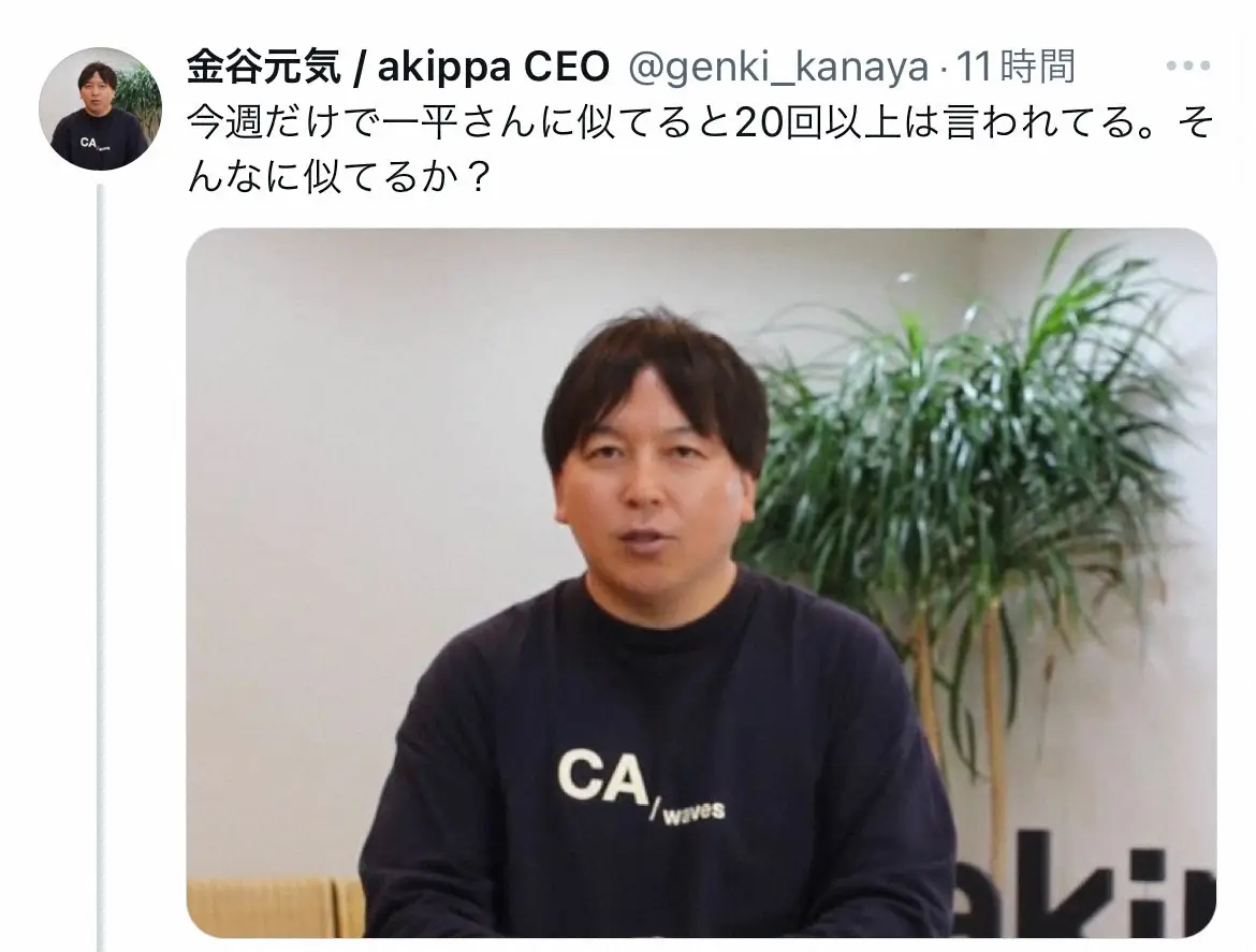 「akippa」の代表取締役CEOの金谷元気氏が27日までに自身のX(旧ツイッター)を更新。大リーグ、ドジャースの大谷翔平投手(29)の元通訳で、違法賭博問題で球団を解雇された水原一平氏(39)と自身が似ているのではと明かし、話題を集めている。