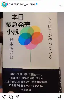 金曜日の番組終了に伴い、この日が水曜日の最終回。番組オープニングトークで、「放送作家を辞めるまで私もあと5日、今日本を2冊出しまして。1つは緊急発売でずっとシークレットで作っていまして」と切り出した鈴木氏。この日発売となった「もう明日が待っている」で、「SMAPとテーマにして、僕がSMAPとか仲間の物語をモチーフにして小説にしたという本が緊急発売して。最初は僕がデビューした後に木村くんと出会い、『SMAP×SMAP』が始まるという話から、最終的に謝罪放送があって、解散していく…そしてその先、そうなっているかということ(を書いている)」と説明した。