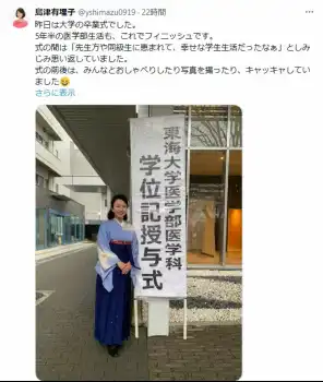 医師国家試験に合格したと明かしていた元NHKアナウンサーの島津有理子さん(50)が27日までに自身のSNSを更新。在籍していた東海大学医学部の卒業式に出席したことを報告した。