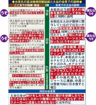 大谷は26日に開いた会見の中で「結論から言うと、彼(水原氏)が僕の口座からお金を盗んで、みんなにうそをついていたことになります」などと説明し、自身の賭博、違法ブックメーカーへの送金を含めて賭博への関与を完全否定。新たな水原氏のうそについても言及し、今後は大リーグ機構(MLB)、警察などの調査、捜査に全面協力する意向を示した。米メディアの報道では、大谷の口座から少なくとも450万ドル(約6億8000万円)が送金されたという。