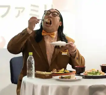 春の新グランドメニュー発表に合わせたもので、同社の穴見くるみ社長と登壇し「デミグラスハンバーグ&有頭えびフライ」「蒸し鶏のゴマだれサラダと釜揚げしらす丼」「京都宇治抹茶バウムクーヘンとわらび餅の黒蜜がけ」の3品を試食。大きな有頭えびフライを口いっぱいに頬張りながら「たまんないね!えびが大きくて美味しい」と大興奮で絶賛した。