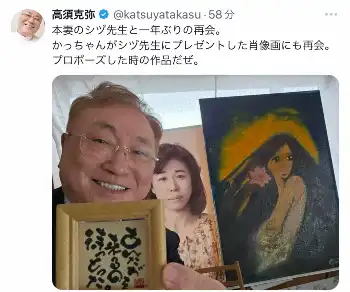 「本妻のシヅ先生と一年ぶりの再会。かっちゃんがシヅ先生にプレゼントした肖像画にも再会」と前妻にプレゼントした肖像画の写真と共に、笑顔を浮かべる自撮りショットを公開。