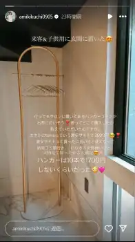 菊地は「来客&子供用に玄関に置いた」とつづり、ゴールドのハンガーラックをストーリーズにアップ。「行ってるサロンに置いてあるハンガーラックがお家に合いそう 思ってどこで購入したか教えていただいたのですが、まさかのtemuっていう激安サイトで3600円」と明かした。