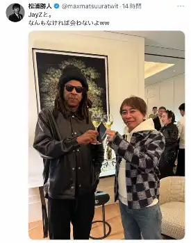 松浦氏は「JayZと。なんもなければ会わないよww」と米で絶大な人気を誇り、歌手・ビヨンセの夫でラッパーのJayZとグラスを交わしている写真を披露。