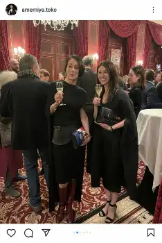 「会場には江里子さんもいらして、一緒に乾杯」とパリ在住のフリーアナウンサー・中村江里子との黒の装いでグラスを手にした2ショットも投稿した。