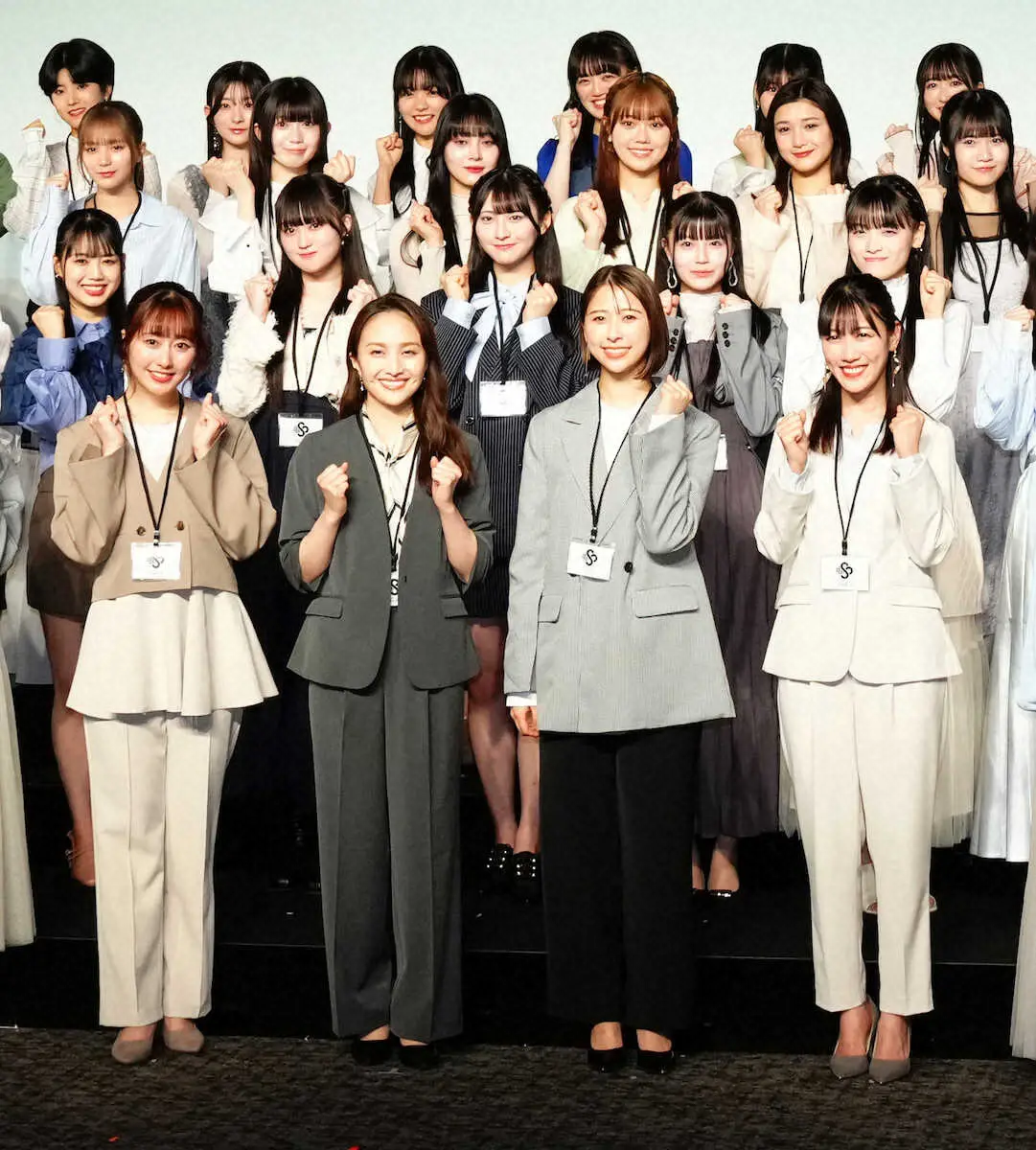 会社という設定にちなんで、全メンバー69人がアイドル衣装ではなくオフィスカジュアルな姿を披露。首から下げた社員証について、佐々木彩夏(27)は「念願だった」と喜びを口にした。そして「私は言わずもがな、可愛さが最大の特長。この可愛さをアピールしてくださるお仕事をお待ちしております」と笑顔で呼びかけた。