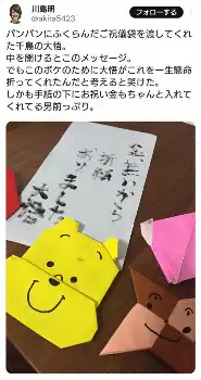 川島は自身のX(旧ツイッター)で16年3月に「パンパンにふくらんだご祝儀袋を渡してくれた千鳥の大悟。中を開けるとこのメッセージ」とつづり、「金、無いから折紙おりました」と書かれたメモと、折り紙を披露。「でもこのボケのために大悟がこれを一生懸命折ってくれたんだと考えると笑けた。しかも手紙の下にお祝い金もちゃんと入れてくれてる男前っぷり」と報告していた。