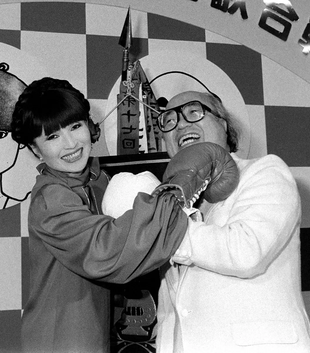 1983年、「第34回NHK紅白歌合戦」司会者発表で、本番へ闘志を見せる白組司会・鈴木健二アナウンサー(右)と 紅組司会・黒柳徹子