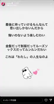 浜崎は「最後に持っていけるもんなんて思い出しかないんだから 悔いのないよう楽しむわい」とコメント。「金髪だって制服だってルーズソックスだってルンルンだわい これは『わたし』の人生なのよ」とつづった。