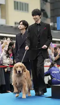 ブルーカーペットを歩く長谷川博己と北村匠海(撮影・郡司 修)