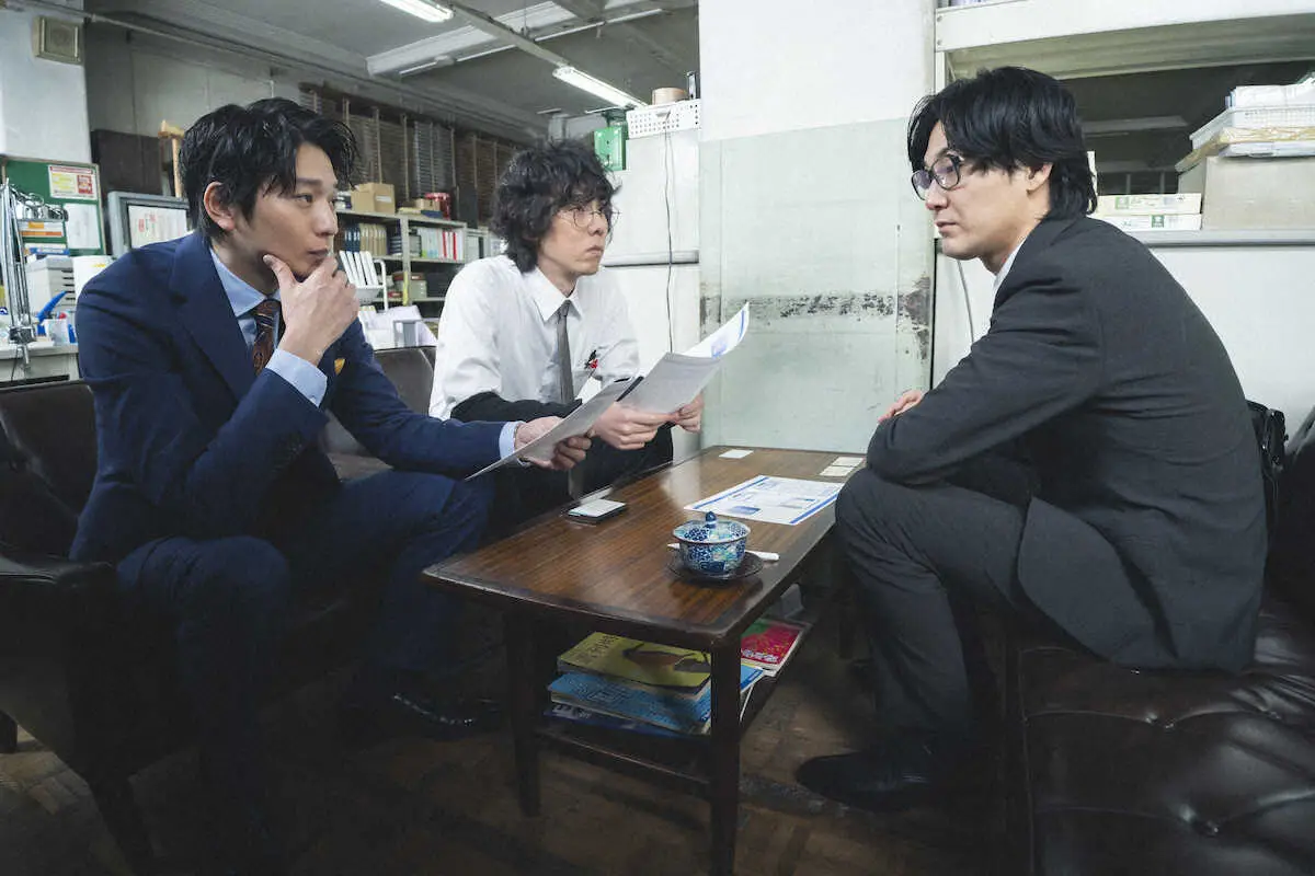 NHKプレミアムドラマ「舟を編む ~私、辞書つくります~」に出演した(右から)松田龍平、野田洋次郎、向井理