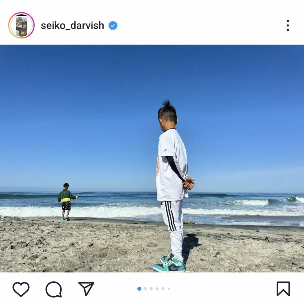 ダルビッシュとともに5人の子供を育てている聖子さん。「毎回ビーチ行く前は砂がつくから嫌だとかいうパパ似思考の男の子達笑」と書き出すと、ビーチで遊ぶ子供たちのショットをアップ。
