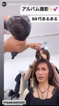ストーリーズでアルバム撮影のため髪をセットする様子を投稿。「アルバム撮影 50代あるある」として「基本的に白髪を毎回染めるのが面倒くさいかもしれない。ごまかしながらいる感じ」と語ったもの。