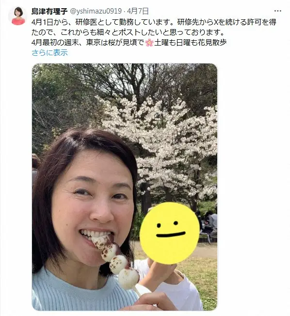 「4月1日から、研修医として勤務しています」と書き出すと、桜をバックに団子をほおばるショットをアップ。