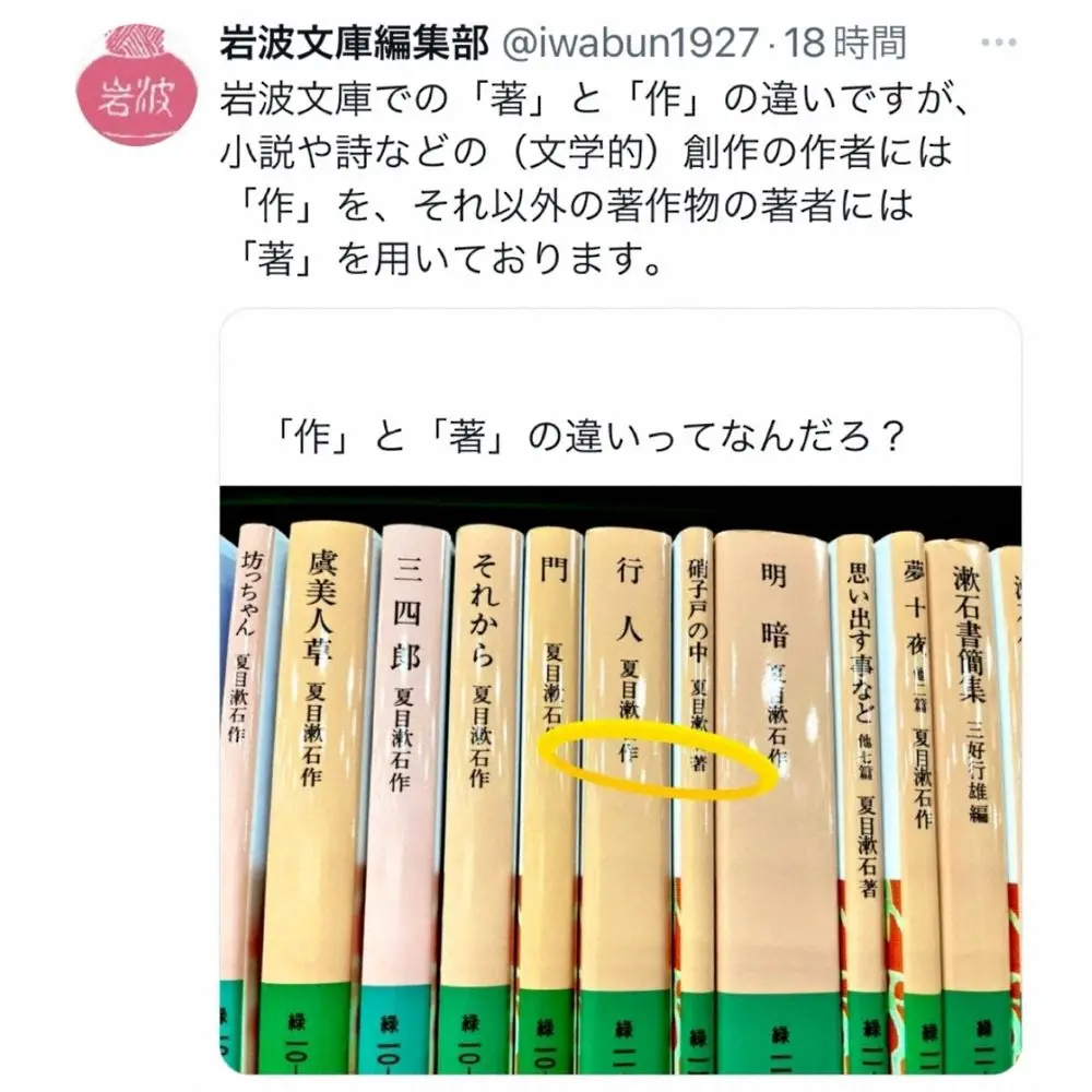 投稿には、岩波文庫の夏目漱石の作品がずらりと並べられた写真が添えられた。よく見ると、「作」と「著」が使い分けられており、ユーザーはこのことに初めて気が付いた様子だった。