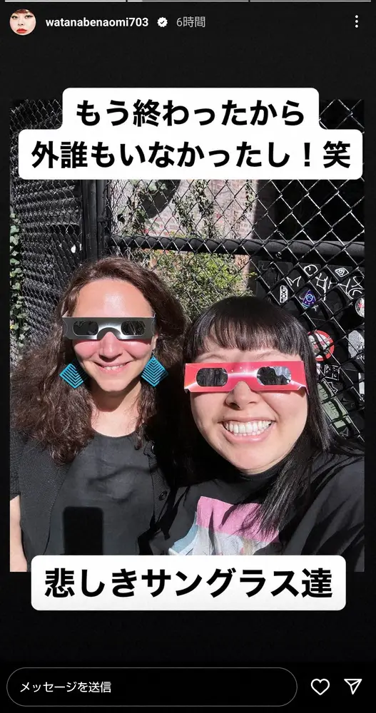 また続く投稿で「もう終わったから外誰もいなかったし!笑」とつづり、「悲しきサングラス達」と太陽観測用の紙製サングラスを着けた姿を披露した。