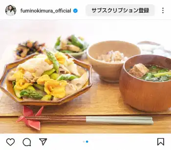 日々の手料理をインスタグラムで披露している木村。この日は「アスパラとたまごとぶたの春色炒め ひじき煮 ささかまとピーマンのゆかり炒め 焼きイワシ ほうれん草と厚揚げのおみそ汁 雑穀米ごはん」の写真を掲載した。