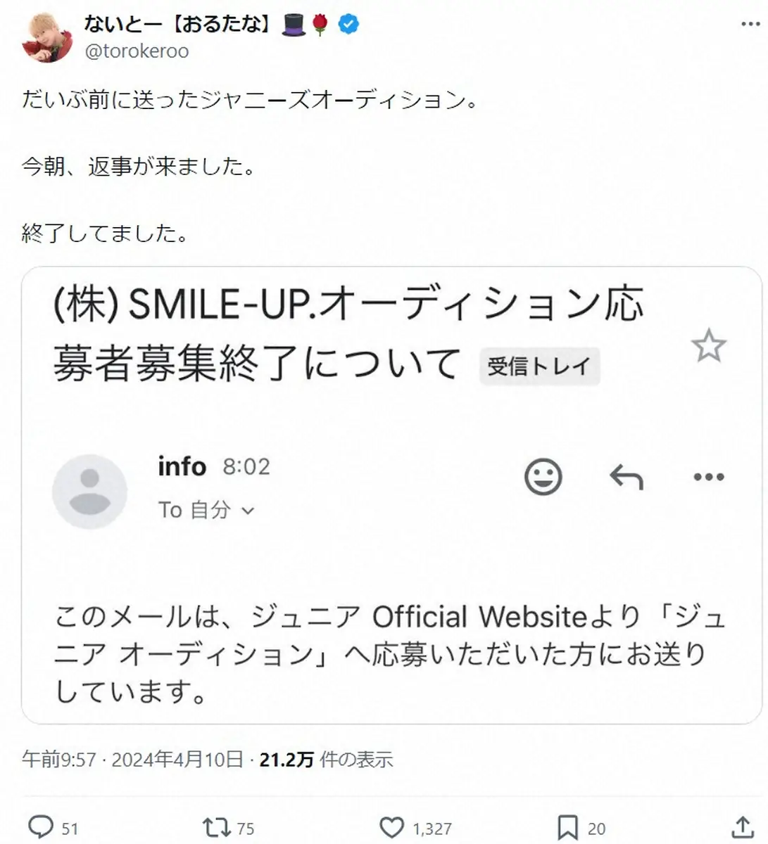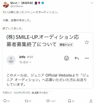 おるたなch・ないとーインスタグラム(@torokero)から おるたなCh・ないとー 昨年応募した旧ジャニオーディションに動き「今朝… ギャラリーで見る この記事のフォト 2024年04月10日の画像一覧 もっと見る 2024年04月10日の画像をもっと見る