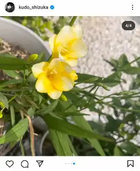 続けて、自身が庭で育てている「春に咲く冬の名前 香雪蘭 フリージアの黄色が咲きました」と喜びの報告。