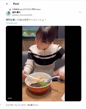 昨年12月にHKT48を卒業した田中美久(22)が11日、自身のX(旧ツイッター)を更新。博多ラーメンを食べている様子を映した動画を投稿した。