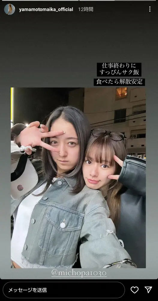 山本はストーリーズで「仕事終わりにすっぴんサク飯」とコメント。「食べたら解散安定」とタレントの「みちょぱ」こと池田美優との2ショット写真を掲載した。
