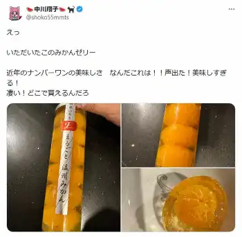 中川は「えっ」と驚がく。「いただいたこのみかんゼリー 近年のナンバーワンの美味しさ なんだこれは!!声出た!美味しすぎる!凄い!どこで買えるんだろ」と投稿した。