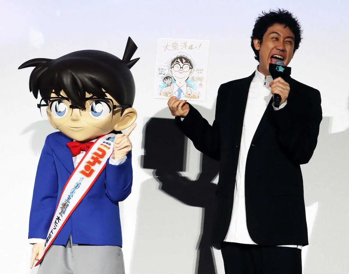 大泉は北海道警の刑事・川添善久役でゲスト出演。原作の青山剛昌氏から直筆イラストをサプライズでプレゼントされ「やったー。めちゃくちゃうれしい。善久のスピンオフを描いてほしい」と歓喜していた。