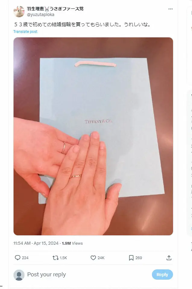 理恵さんは「53歳で初めての結婚指輪を買ってもらいました。うれしいな」とつづり、羽生九段とともに左手薬指に指輪をはめた写真をアップした。二人の手のそばにはティファニーのショップバックも添えられていた。