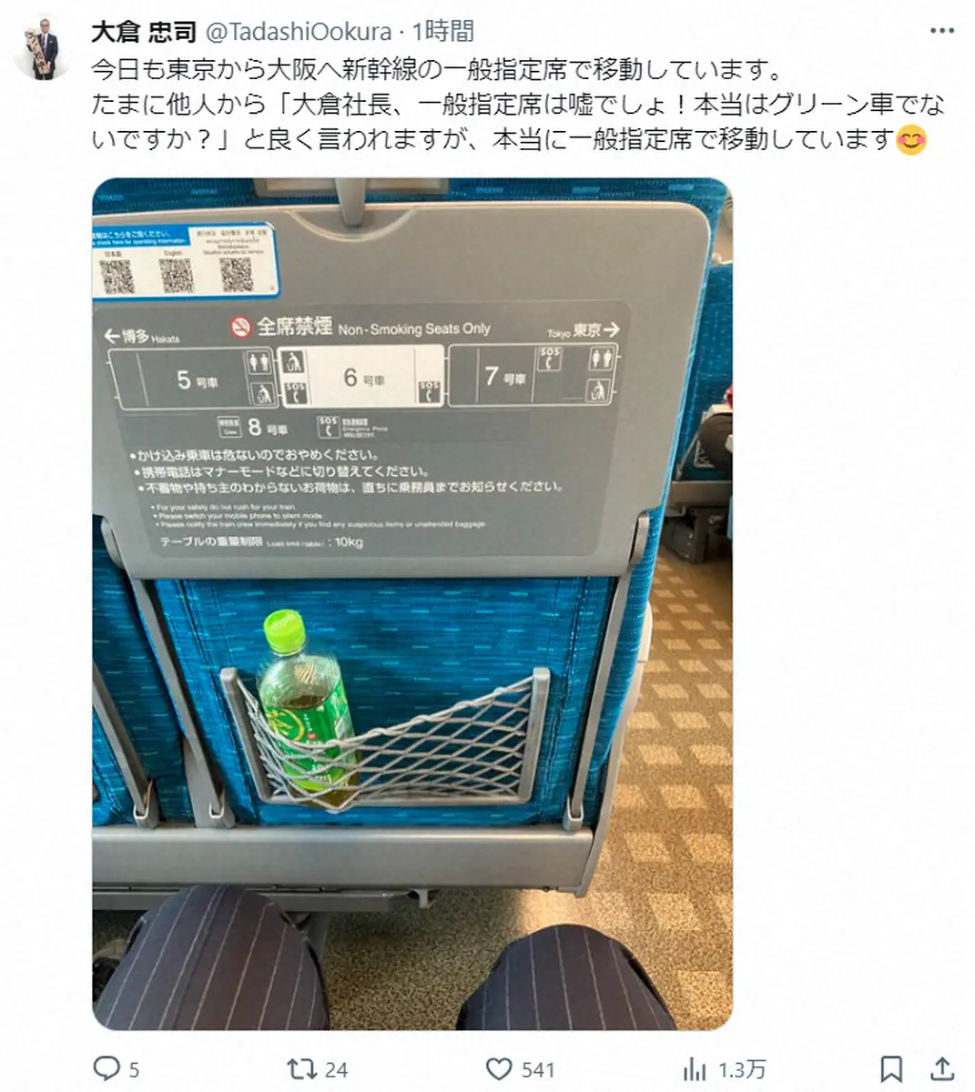 「たまに他人から『大倉社長、一般指定席は嘘でしょ!本当はグリーン車でないですか?』と良く言われますが、本当に一般指定席で移動しています」と記した。