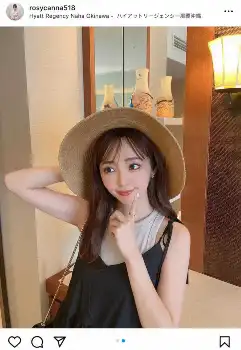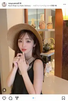 「ということで、去年お母さんと行った沖縄のホテルでの写真。今年はお母さんを海外の海に連れて行けるかもなのでワクワク」と麦わら帽子を被った袖なしブラックワンピースファッションの写真を投稿した。