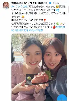 そのうえで「松井珠理奈自然体でこれから頑張ります」と意気込み、「大好きなさゆりんごとの2ショットだよ」と元乃木坂46のタレント・松村沙友理と刺身を前に顔を寄せ合い笑顔のショットをアップ。