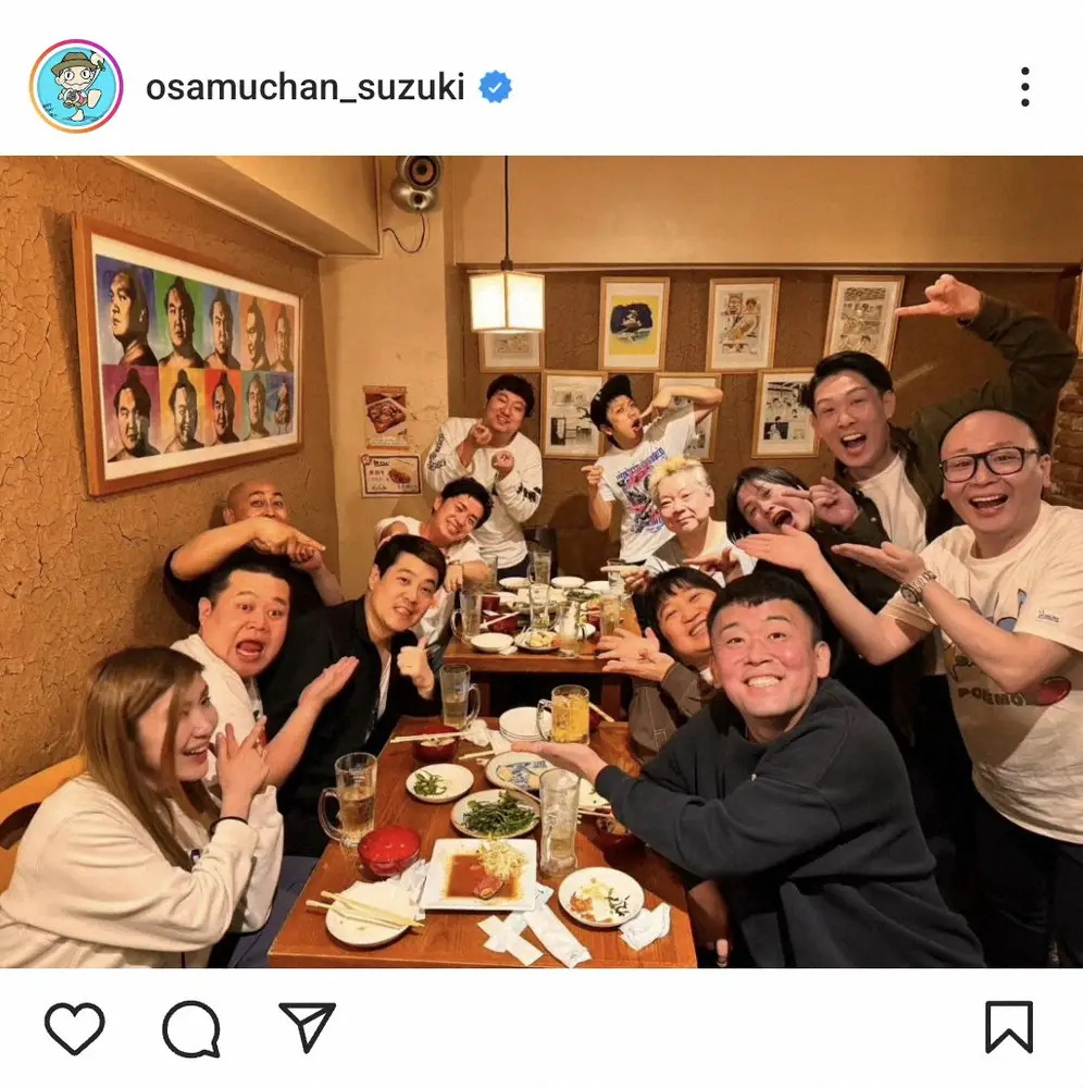 「タカ誕生日おめでとう!」と書き出すと、飲食店でタカを囲んだ自身やお笑いコンビ「錦鯉」長谷川雅紀、「モグライダー」ともしげ、「納言」薄幸らの集合ショットをアップ。