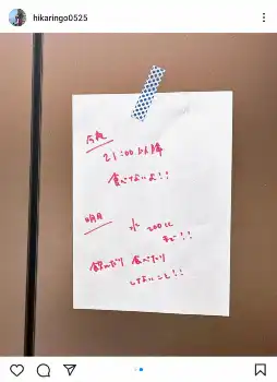 前日の投稿では「あしたは人間ドックです」と宣言。「うっかり食べたりしないようお風呂入って早めに寝ます」と冷蔵庫に貼った注意書きの写真を掲載したが、「実はさっきまでうっかりキウイを食べていた 15分オーバーくらい!」とつづっていた。