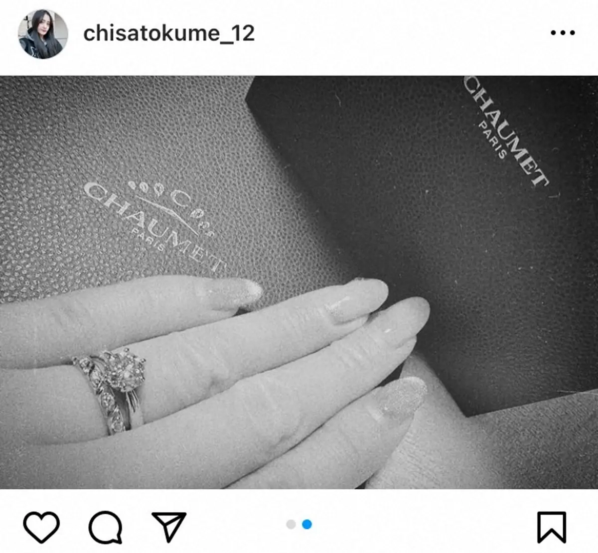 インスタグラムでは「この度私久米知里は兼ねてよりお付き合いをしていた方と結婚することになりました」と報告。2人で薬指に指輪を付けたショットを公開した。