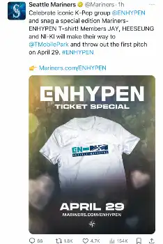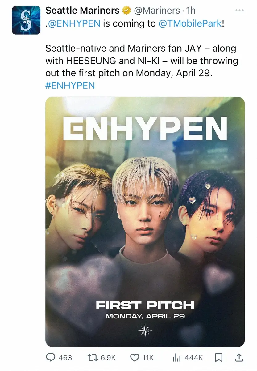 MLBシアトル・マリナーズが公式Xを18日(日本時間19日)に更新。ENHYPEN(エンハイプン)のJAY(ジェイ、21)、HEESEUNG(ヒスン、22)、NI-KI(ニキ、18)が、29日(日本時間30日)に米ワシントン州シアトルのT-モバイルパークで行われるシアトル・マリナーズ対アトランタ・ブレーブス戦の始球式に登場することを発表した。