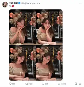 小嶋は「36」とのコメントとともに4枚の写真をアップ。夜の東京タワーをバックにバースデーケーキの前でほほ笑むショットなどを披露した。