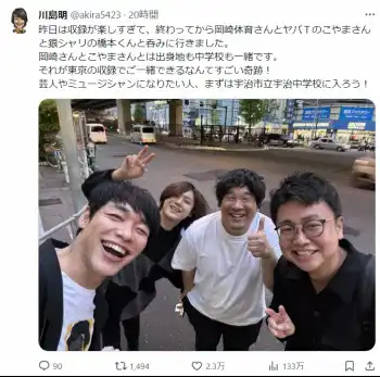 川島明 人気ミュージシャンらとの食事報告「出身地も中学校も一緒です」と告白 「すごっ!」と反響