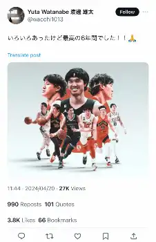 Bリーグ参戦の渡辺雄太 自身Xで「最高の6年間でした!!」 世界中からエール「ユウタが大好き」