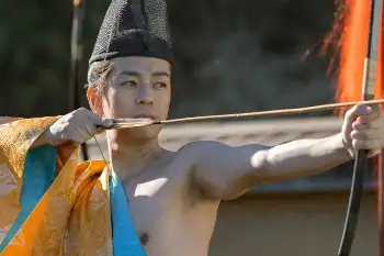 伊周は「我、関白となる」。大きく的を外す。道長も「我、関白と…」と弓を引くと、道隆がたまらず「やめよ!」。父子揃って苦虫を噛み潰した。