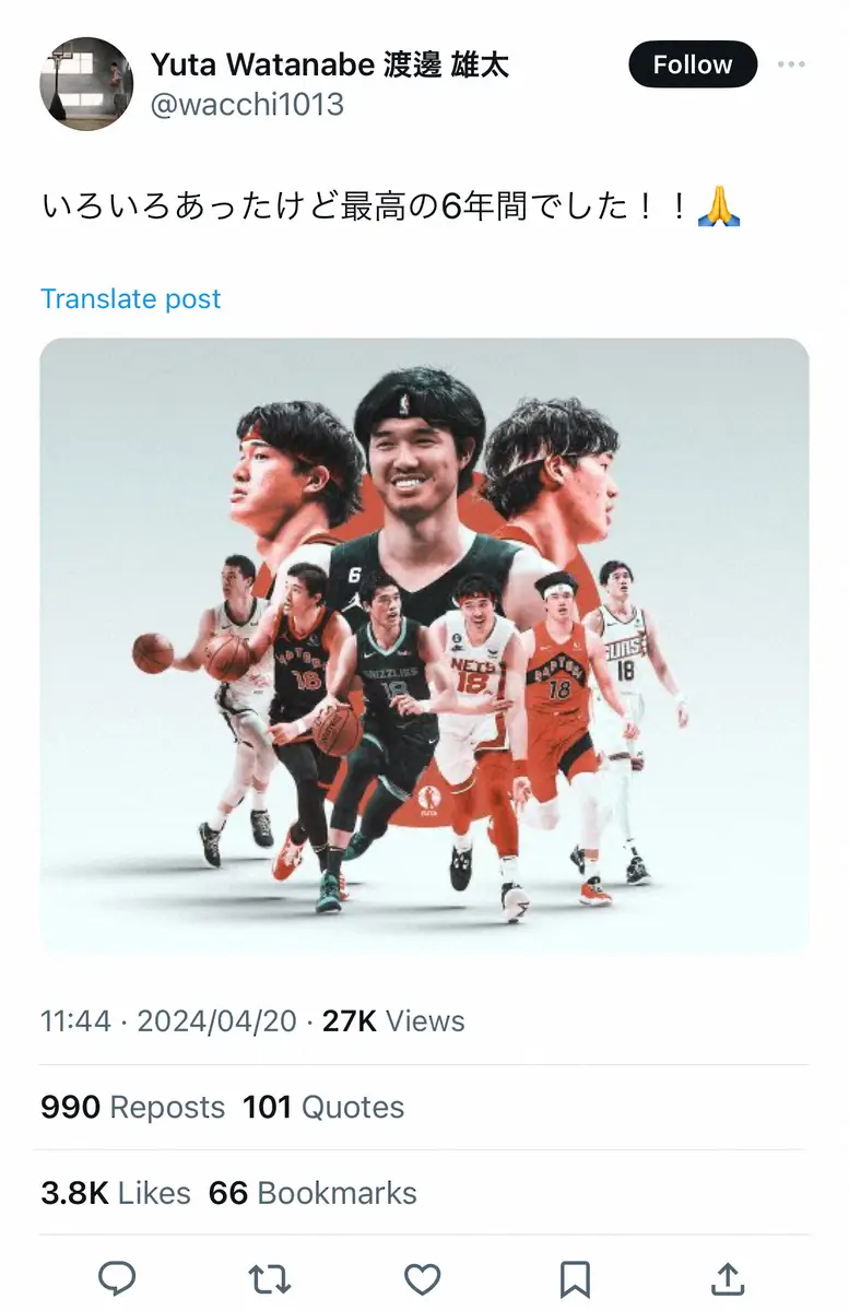 NBAで6季目のシーズンを終えた渡辺雄太(29)が20日、自身のXを更新。自身のNBAでの経験を振り返った。