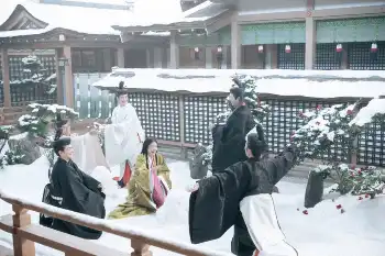 大河ドラマ「光る君へ」第16話。「雪遊び」を楽しむ(左から)藤原伊周(三浦翔平)一条天皇(塩野瑛久)藤原定子(高畑充希)(C)NHK