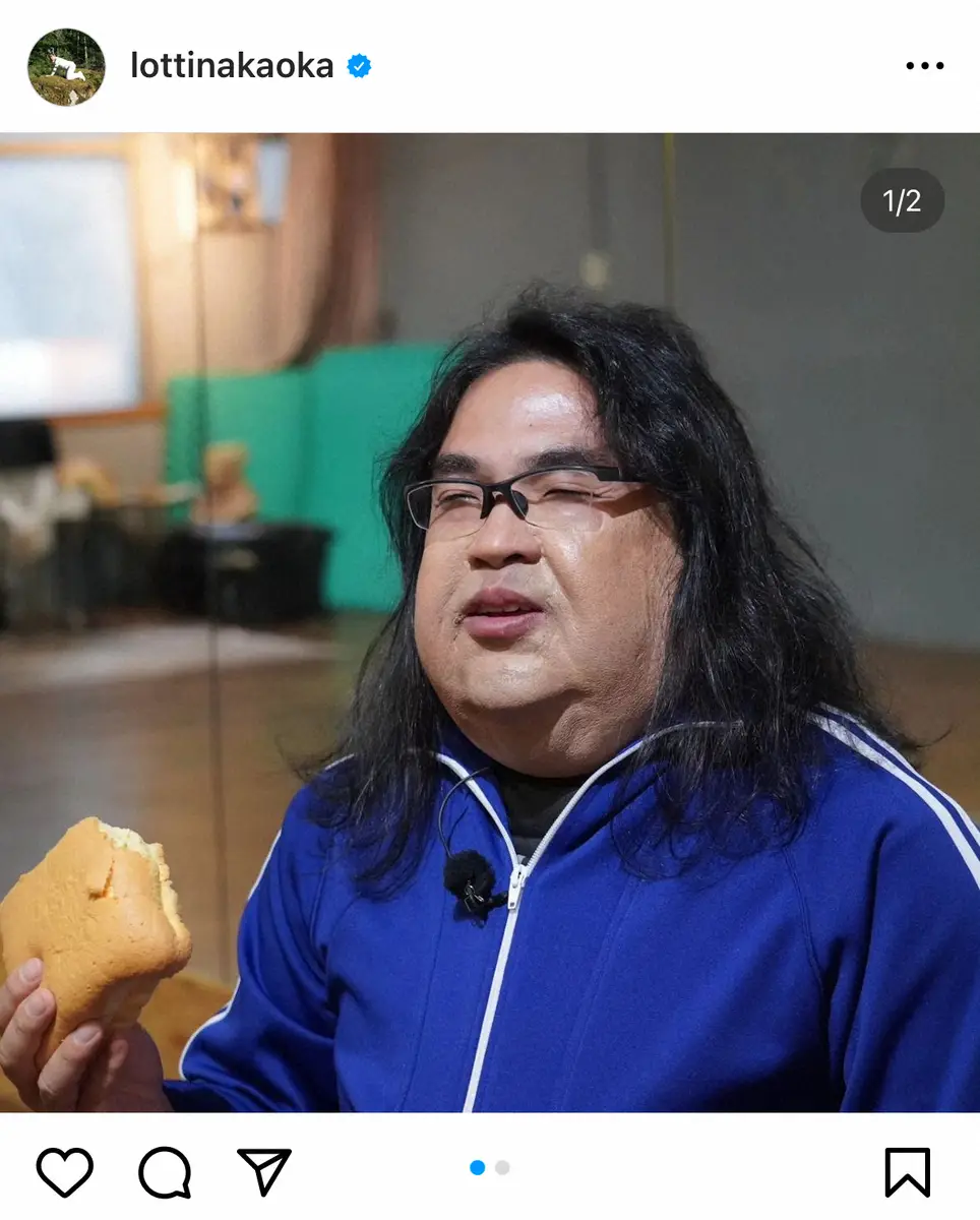 「進化する中岡 ノンストレスが1番やん」と書き出すと、青いジャージー姿でカステラを頬張る様子をアップ。この写真に写る中岡のフェイスラインはいつもより膨れ上がっていた。
